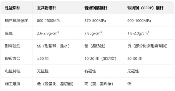 玄武岩纤维本身为无机材料,不与水、酸、碱、盐等介质发生化学反应,配合耐腐树脂基体后,可完全抵御地下卤水、矿山酸性水、沿海盐碱环境的侵蚀。相比之下,传统钢筋锚杆在潮湿或腐蚀性环境中易锈蚀,导致截面削弱、承载力下降,而玄武岩锚杆的服役寿命可达 50 年以上,无需额外防腐处理。